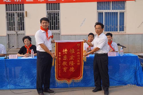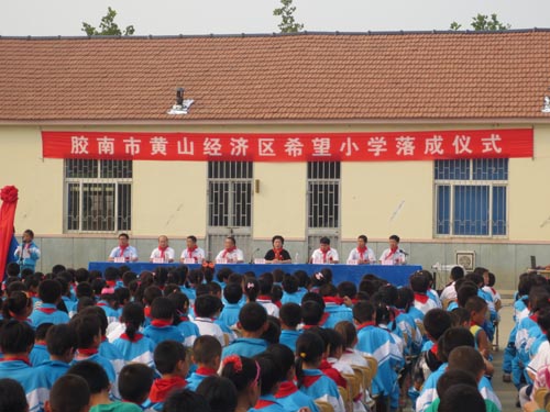 9月20日下午,秋高氣爽、陽光明媚,膠南市黃山經(jīng)濟區(qū)希望小學(xué)落成儀式在學(xué)校大操場隆重舉行。激昂的國歌聲后,少先隊員們?yōu)槌鱿I(lǐng)導(dǎo)敬獻(xiàn)紅領(lǐng)巾,以此來表達(dá)孩子們的崇高敬意。一位學(xué)生代表用稚嫩的童音道出了對青島海川建設(shè)集團及支持希望工程事業(yè)建設(shè)的各類愛心團體的誠摯感謝,和臺下上千名含苞待放,映襯在陽光里的一張張幸福笑臉一樣,他們都是祖國的未來和希望,也讓在場的每一位成年人對“捐資助教、功德無量”這句話有了更深刻的理解和感悟。黃山經(jīng)濟區(qū)希望小學(xué)校長懷著激動地心情向海川集團贈送錦旗一面,愛心助學(xué)的善舉也贏得了在場師生一次又一次熱烈的掌聲。集團黃中坡副總裁代表發(fā)言,他特別指出,今年恰逢集團成立60周年之際,本著“節(jié)儉辦大慶”和“注重社會公益性”的宗旨,集團將主要活動資金拿出來援建黃山經(jīng)濟區(qū)中心小學(xué),另外發(fā)動企業(yè)職工向老一輩建筑人曾經(jīng)援建過的四川藏族甘孜地區(qū)捐獻(xiàn)衣物。通過一系列與社會接軌的主題活動,力爭將本次大慶辦得更有意義。最后他衷心希望膠南市黃山經(jīng)濟區(qū)中心小學(xué)的全體同學(xué)從小樹立遠(yuǎn)大目標(biāo),刻苦學(xué)習(xí),努力向上,爭做國家棟梁之才,立志回饋社會,報效祖國。青島團市委副書記張海軍和膠南市委副書記佟海燕也出席儀式并與海川集團黃中坡副總裁一起為希望小學(xué)揭牌,同時就海川集團對教育公益事業(yè)的傾情參與和大力支持給予了充分肯定和高度評價。
