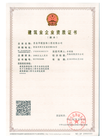 至此,青島華聯(lián)裝飾擁有專業(yè)承包資質(zhì)三項:建筑裝修裝飾工程專業(yè)承包壹級、電子與智能化工程專業(yè)承包貳級、建筑幕墻工程專業(yè)承包貳級;設計資質(zhì)一項:建筑裝飾工程設計專項甲級。