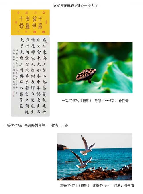 海川集團員工在海川書畫攝影研究會的牽頭下積極參與此次展覽,創(chuàng)作精力充沛,在短短一周內(nèi)創(chuàng)作作品數(shù)十幅。展覽期間,主辦單位共收到各類參展作品294幅,其中:書法類作品83幅,繪畫類作品65幅,攝影類作品139幅,手工才藝類作品7件。在此次展覽中海川集團員工周天馬、丁磊、孫良青、楊興強、寧楊、王森的作品入展并在市城鄉(xiāng)建委一樓大廳展出。這些作品主題鮮明、風(fēng)格多樣。在展覽后評獎中,孫良青攝影作品《呼吸》獲攝影作品一等獎,《比翼齊飛》獲三等獎;王森《書法篆刻合璧》獲書法類一等獎。