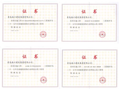 近日,海川集團(tuán)從中國建筑裝飾協(xié)會(huì)捧回4項(xiàng)全國建筑裝飾行業(yè)“科技示范工程”和4項(xiàng)“科技創(chuàng)新成果”的證書和獎(jiǎng)牌。分別為: