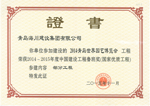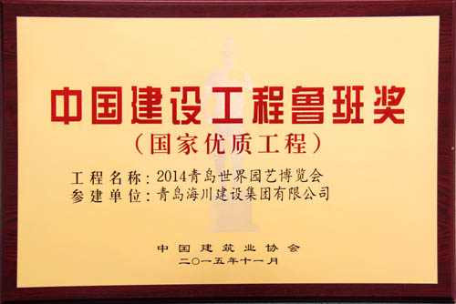 由海川集團承建的2014青島世界園藝博覽會工程榮獲2014-2015年度中國建設工程魯班獎(國家優(yōu)質工程)。表彰大會于2015年11月16日在北京釣魚臺國賓館舉行,海川建設集團有限公司四分公司主任工程師張棟參加了會議,并捧回中國建設工程魯班獎(國家優(yōu)質工程)獎牌及證書。