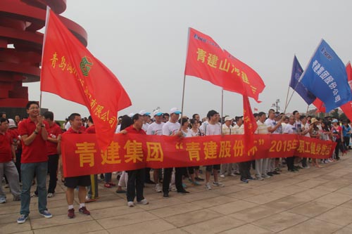 青建集團 “青建股份杯” 2015年職工健身跑(健步行)活動6月27日(周六)上午9:00在五四廣場“五月的風”雕塑下舉行開幕式,共有來自青建系統(tǒng)各單位的500余名員工踴躍參加了本次活動,青建集團執(zhí)行總裁朱廣君致辭并為方隊鳴哨開跑。